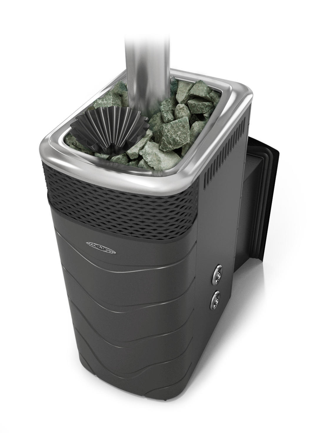 Верхняя часть внешнего кожуха-конвектора «Гейзера XXL 2017 Carbon» декорирована металлической волнообразной сеткой, придающей столь внушительной конструкции более эстетичный и облегченный вид.