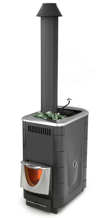 Печь банная паровая Скоропарка 2017 Inox с дверцей из нержавеющей стали, с коротким топливным каналом, со встроенным баком для горячей воды, антрацит