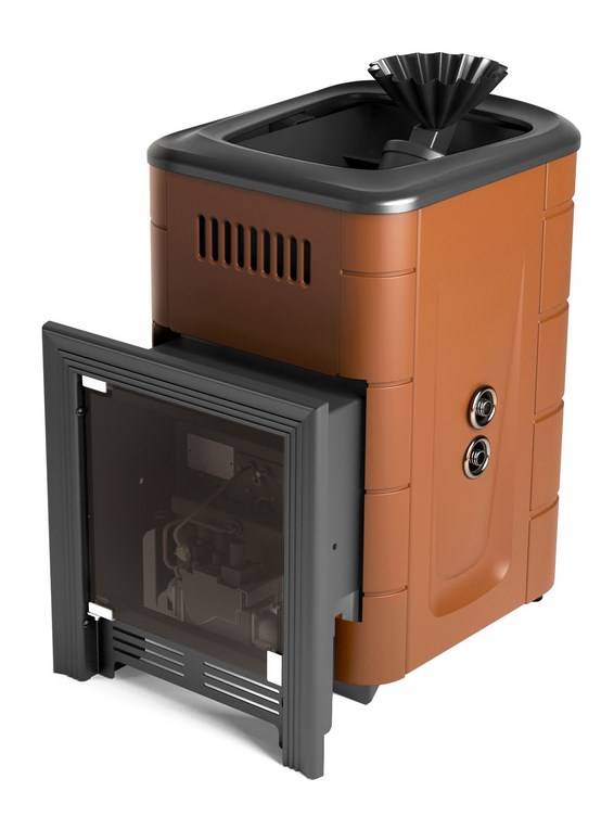 Печь-каменка банная Таймыр Мини 2017 Carbon с большим светопрозрачным экраном, с закрытой каменкой, с теплообменником, терракота
