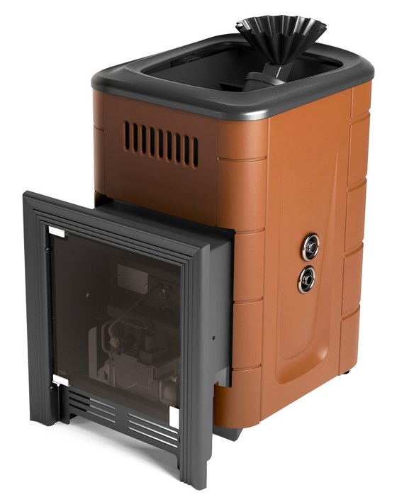 Печь-каменка банная Таймыр Мини 2017 Inox с большим светопрозрачным экраном, с закрытой каменкой, с теплообменником, терракота