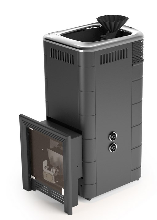 Печь-каменка банная Таймыр XXL 2017 Inox с большим светопрозрачным экраном, с закрытой каменкой, с теплообменником, антрацит