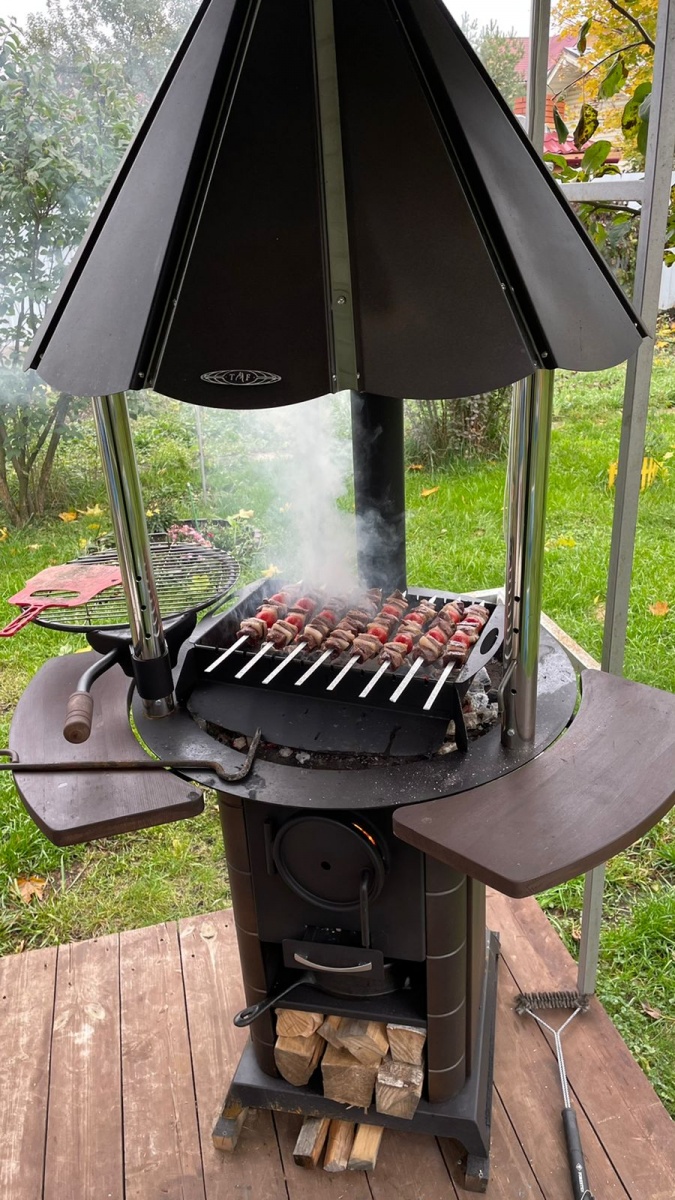 Он служит для сбора и вытяжки дыма через отверстие в его верхней части, а также защитой от осадков. Лепестковая конструкция купола придает красивый внешний вид грилю и лаконично впишется в экстерьер вашего приусадебного участка.